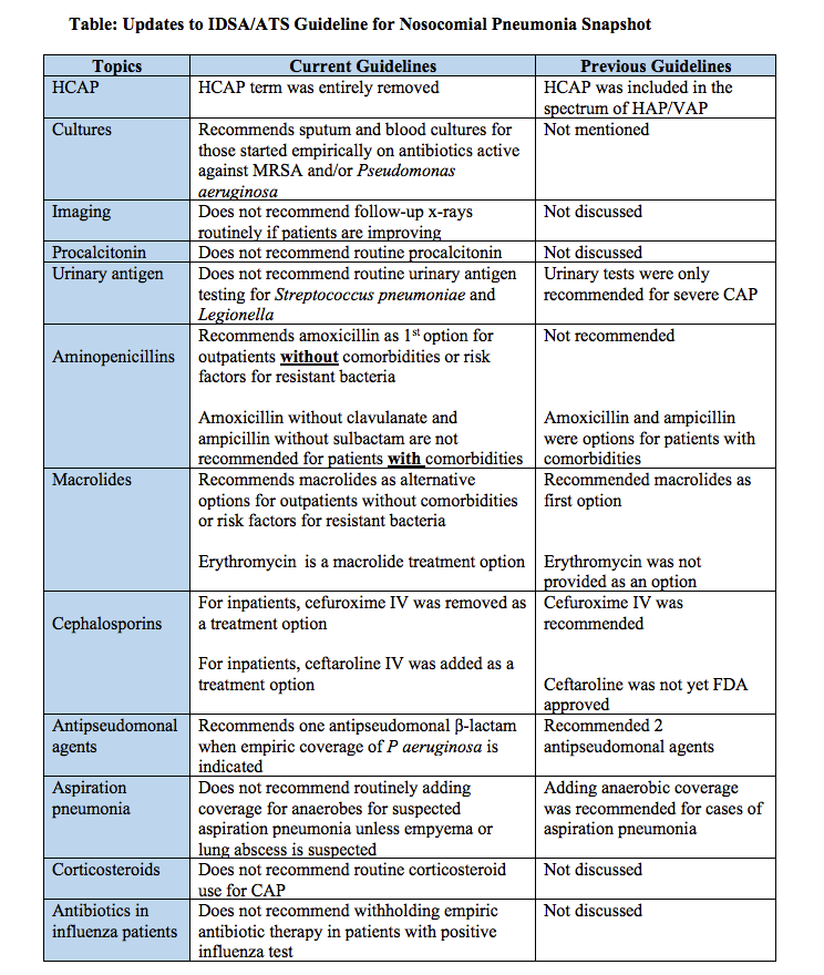 After about 12 years, a joint update of the community-acquired pneumonia (CAP) guidelines was recently published by the American Thoracic Society and the Infectious Diseases Society of America.1,2 This article highlights some key updates to the antimicrobial therapy recommendations.